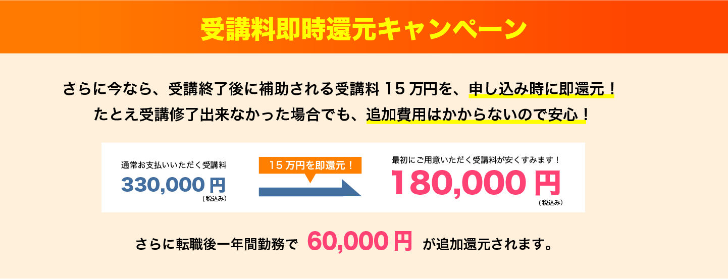 | 実質負担[お申込み時にお支払い頂く金額18万円] | 12万円(税込) |